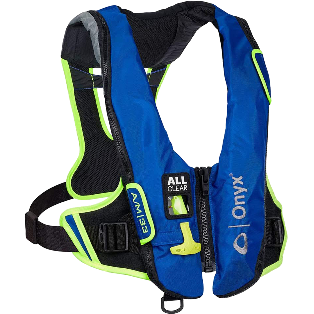 Onyx A/M-33 Impulse All Clear Inflatable Lifevest, Blue Convertible from automatic/manual to manual only inflation. Front zipper closure for a low profile secure fit, air mesh in contact areas, dual adjustments with "webbing locks" to manage excess webbing. Secure Pull -- clips to life jacket allows for quick release when pulled for inflation, Quickburst zipper opens upon inflation easy to repack, inflation chamber has SOLAS grade, reflective material and light attachment, V-back for comfort and faster donning. Features a 1.5" body belt, protective cover uses durable 400 denier nylon oxford and 500 denier Cordura, hanging loop for drying, marine whistle included, extended sizing fits up to a 65" chest.